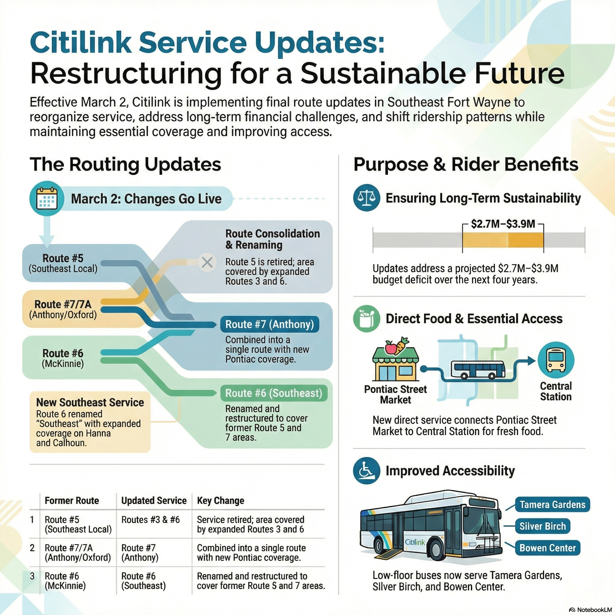 Beginning Monday, March 2, Citilink will implement service updates affecting parts of Southeast Fort Wayne. These changes are now final and reflect months of analysis, rider input, and careful…